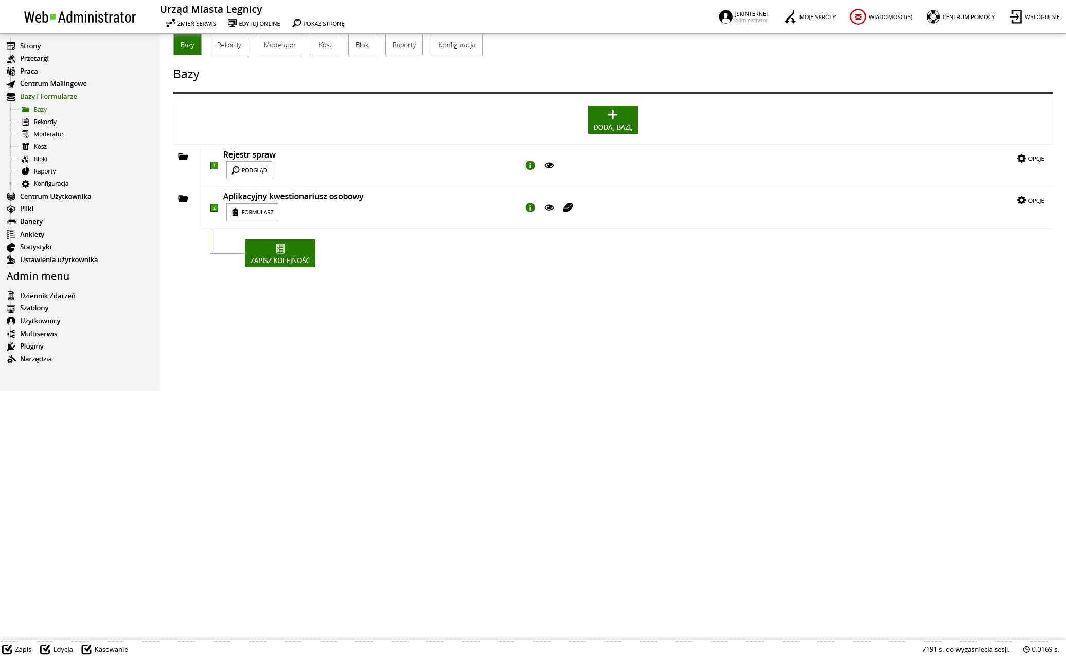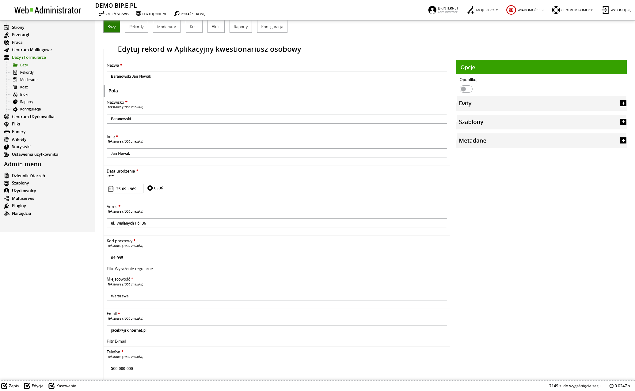 Dane z utworzonych baz w zależności od konfiguracji mogą być dostępne w serwisie dla wszystkich lub ograniczone do osób zalogowanych.