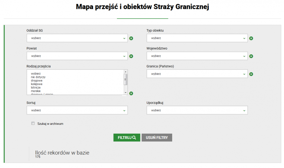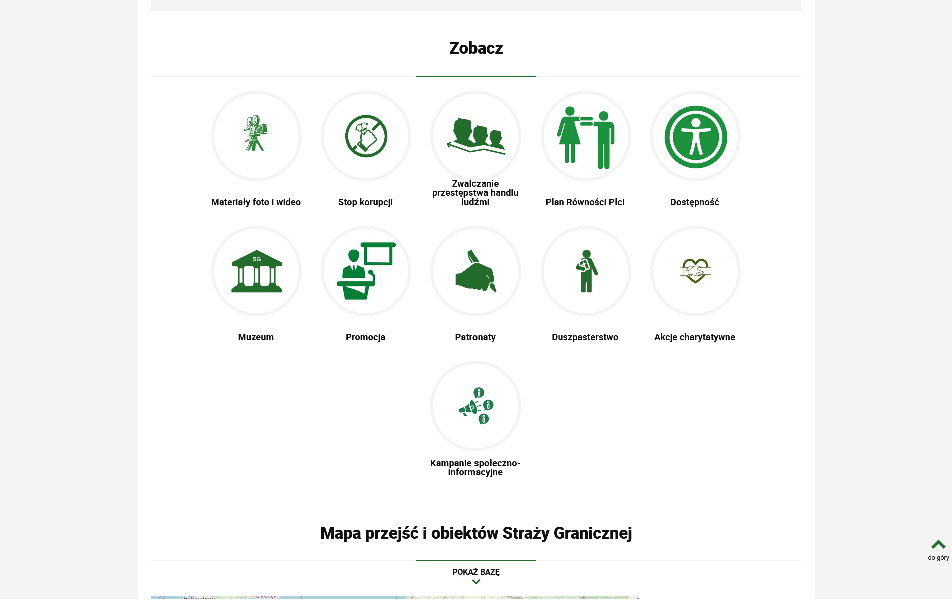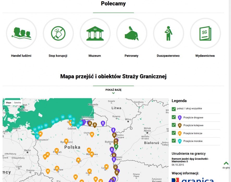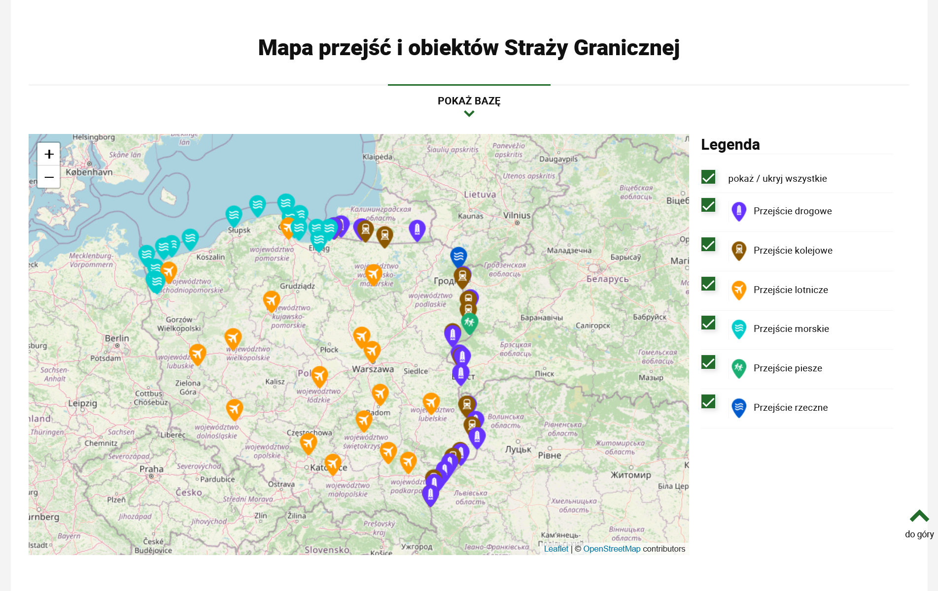 Mapa przejść i obiektów Straży Granicznej to oparta o moduł "Bazy danych i formularze" baza wszystkich rodzajów przejść granicznych, placówek, dywizjonów, ośrodków dla cudzoziemców oraz pozostałych.
