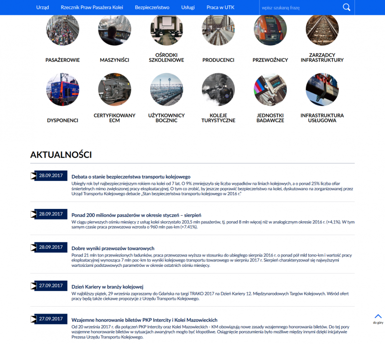 Podstawową zmianą na stronie www jest przejrzyste menu, w którym internauta odnajdzie usługi oferowane przez urząd. Po wejściu w odpowiedni dział pasażer, maszynista, producent czy zarządca infrastruktury można zobaczyć całą ofertę Urzędu przeznaczoną dla danej grupy. Informacje obejmują zakres świadczonych usług, wiadomości oraz – jeśli są aktualnie dostępne – szkolenia w Akademii UTK i najnowsze zmiany w obowiązujących przepisach prawa.