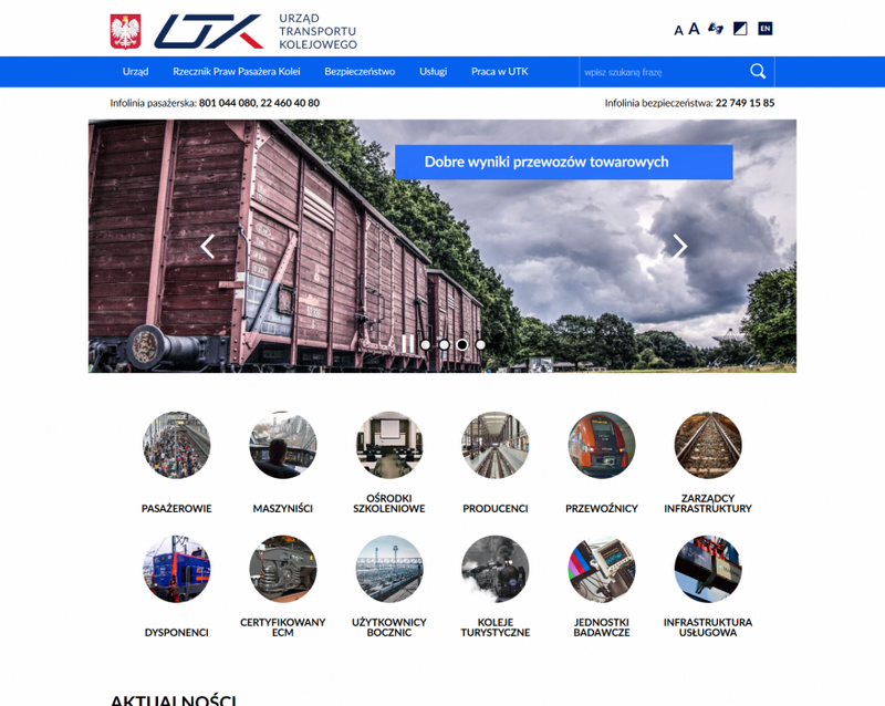 Jednym z najistotniejszych zadań Prezesa UTK jest ciągła poprawa bezpieczeństwa na kolei. Dlatego na stronie w bardzo łatwy sposób można zgłosić zagrożenia w ruchu kolejowym. Ten element wyróżniony jest w dodatkowym górnym menu. W tym miejscu znalazł się też link do ofert pracy. UTK cały czas poszukuje specjalistów w różnych dziedzinach związanych z koleją. Urząd oferuje atrakcyjne warunki pracy, rozwój zawodowy i pewność zatrudnienia.